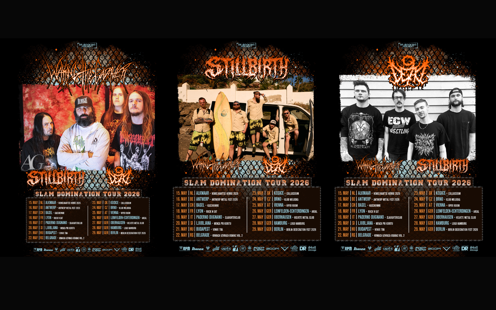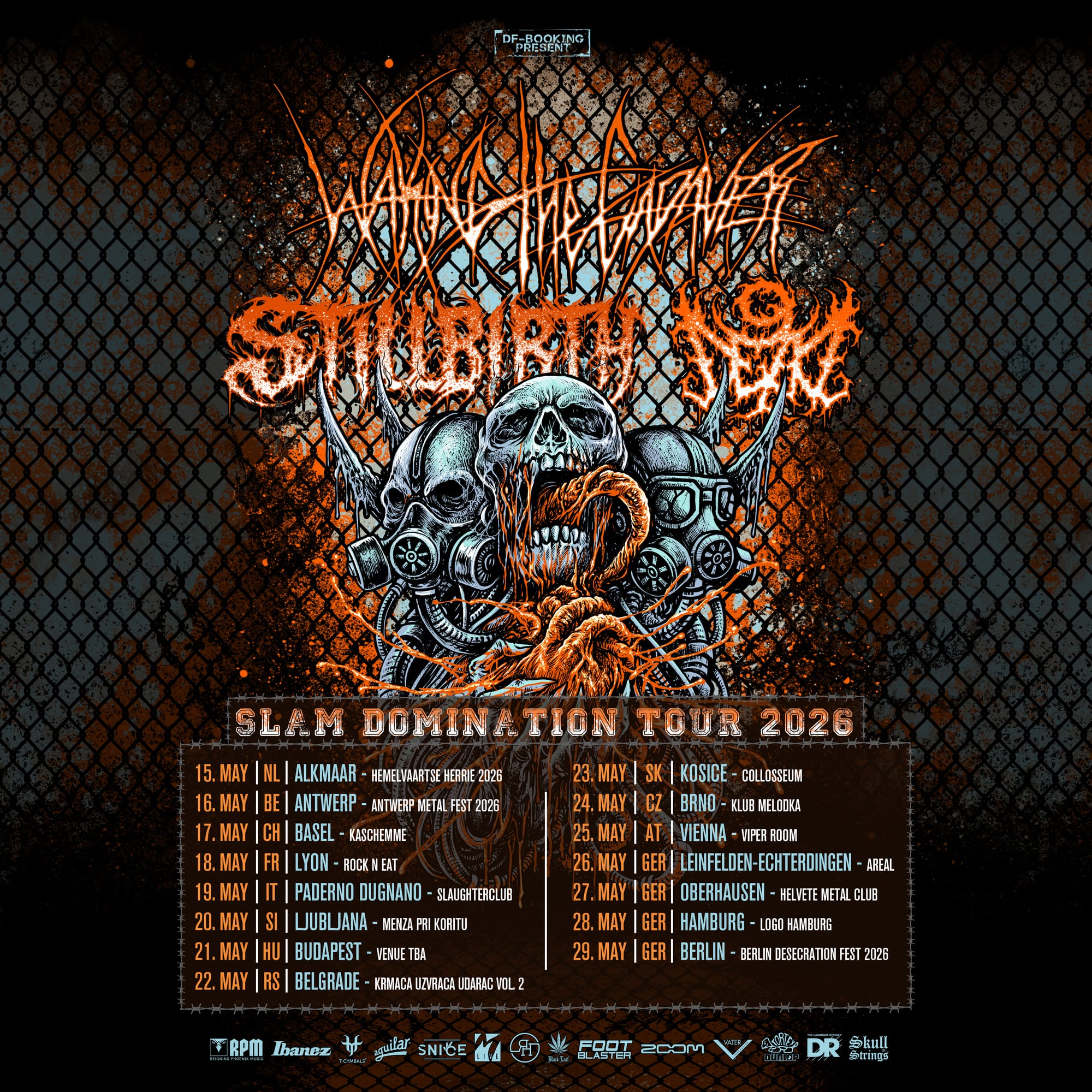 In May 2026, three heavyweights of brutal music will join forces for the SLAM DOMINATION TOUR 2026. US slam legends Waking The Cadaver, Germany’s brutal surf death metal institution Stillbirth, and rising slamming deathcore act 9Dead (USA) will tear through Europe for a relentless run of club shows and festivals.